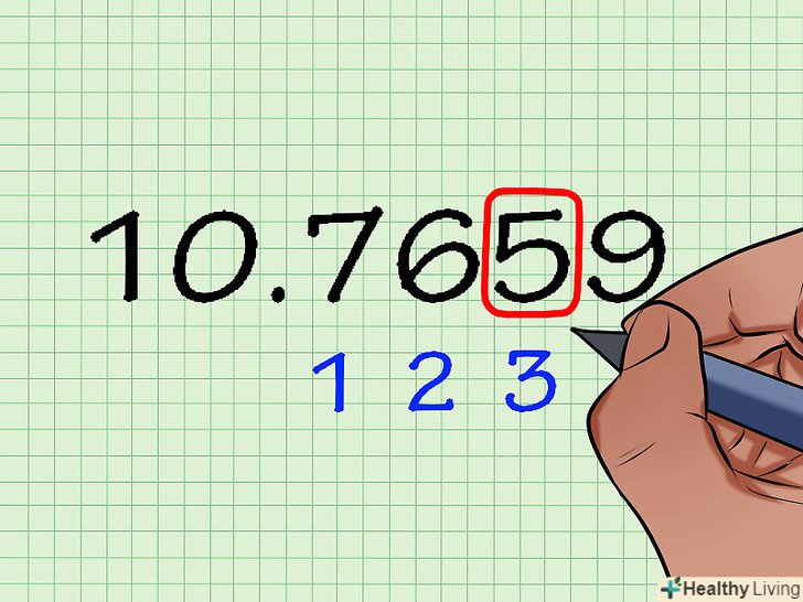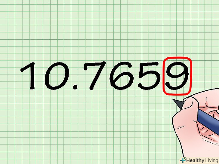Визначте розряд, до якого округляється число.наприклад, ви працюєте з числом 10,7659 і вирішили округлити його до тисячних, розрядом яких є цифра 5, третя цифра праворуч від десяткової точки. Ви також можете вважати це округленням числа до п'яти значущих цифр. Отже, зараз зосередьте увагу на цифрі 5.
