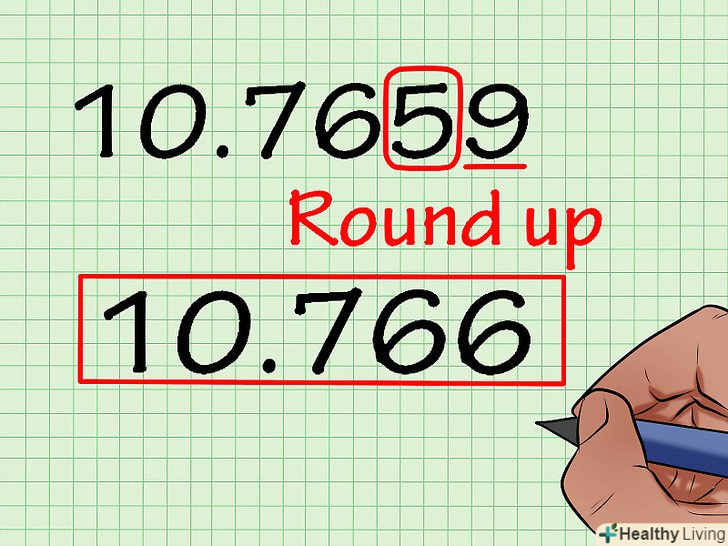 Округліть розглянуту цифру на одну цифру вгору, якщо цифра праворуч дорівнює 5, 6, 7, 8 або 9.це називається округленням вгору, тому що округлюється цифра стає більше. Вихідна цифра 5 стає 6. Всі цифри зліва від 5 залишаються таким же, а числа праворуч зникають (перетворюються в нулі). Тому, при округленні числа 10,7659 до цифри 5, ця цифра буде округлена до 6, а вихідне число стане рівним 10,766 .- Хоча 5 знаходиться в середині ряду цифр від 1 до 9 , вважається загальновизнаним округляти цифру, що передує 5, вгору.