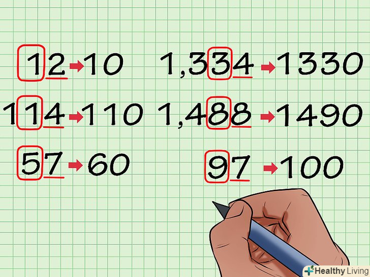 Округліть число до десятків. Десятки-Це друга з кінця цифра, що передує одиницям. Для округлення до десятків дивимося на цифру, що стоїть праворуч від них (якщо візьмемо число 12, то дивимося на 2). Якщо ця цифра 0-4, то округлюється цифра не змінюється; якщо ця цифра 5-9, то округляється цифра стає на одиницю більше. Ось деякі приклади:- 12 --gt; 10