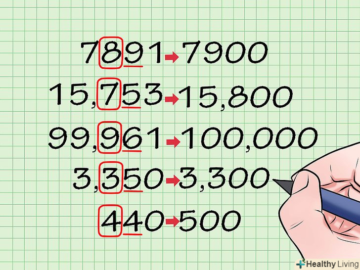 Округліть число до сотень. виконайте ті ж дії для округлення числа до сотень. Сотні - Це третя з кінця цифра, що передує десяткам. (У числі 1234 "2" - це цифра в розряді сотень). Потім за допомогою цифри праворуч (розряд десятків) від цифри в розряді сотень вирішуємо, чи потрібно округлити число вгору або вниз. Ось кілька прикладів :- 7 891 -- gt; 7 900