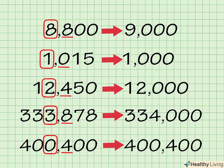 Округліть число до тисяч.ті ж правила застосовні і тут. Просто треба знайти тисячі, четверту цифру з кінця, і перевірити цифру в розряді сотень, яка буде праворуч від цього числа. Якщо цифра 0-4, округляємо вниз, а якщо 5-9, округляємо вгору. Ось ще кілька прикладів для розгляду:- 8 800 --gt; 9 000
