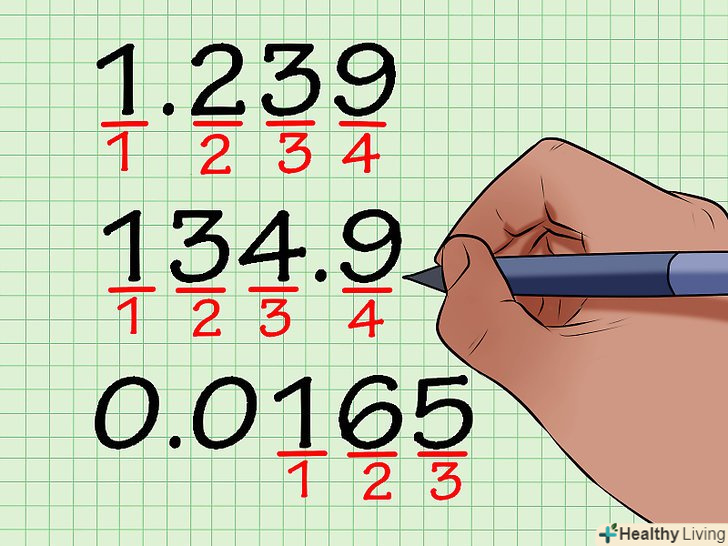 Дізнайтеся, що таке значуща цифра. задумайтеся про значущої цифрі як про "цікавою" або "важливою" цифрі, яка дасть вам корисну інформацію про число. Це означає, що будь-яка кількість нулів справа у цілих чисел або зліва у десяткових можуть не враховуватися, так як не грають значення. Щоб знайти число значущих цифр, треба просто порахувати кількість цифр зліва направо (нулі не рахують). Наприклад:- 1,239 має 4 значущих цифри