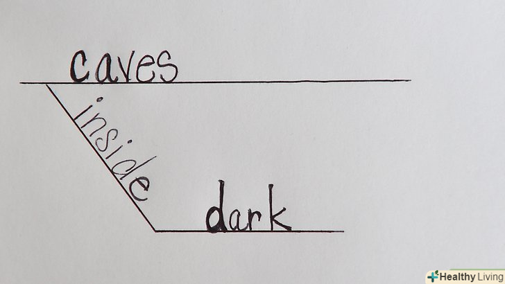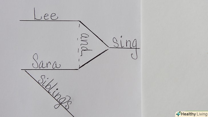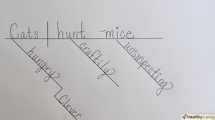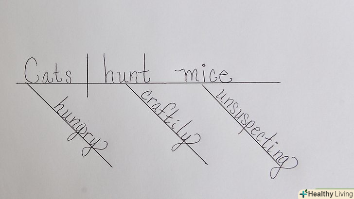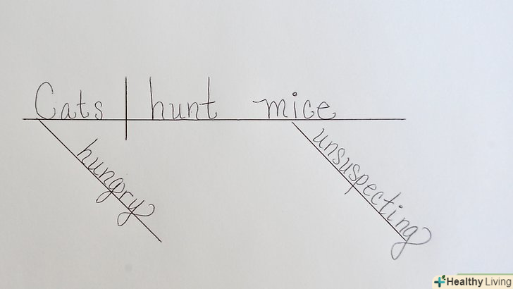 Намалюйте згинається лінію від підмета.впишіть будь-які визначення і опишіть тут підмет. Повторіть будь-які доповнення. Якщо є визначення, що описують прямий об'єкт або предикатив, намалюйте згинається лінію і впишіть визначення туди.