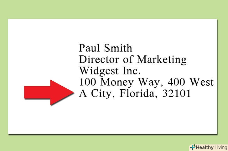 Напишіть назву міста, штат і ZIP-код в третьому рядку.не потрібно писати назву штату повністю, досить написати його скороченням з двох букв. [2]- Ви можете написати дев'ятизначний ZIP-код, але ви не зобов'язані це робити. Зазвичай коду з п'яти цифр цілком достатньо.