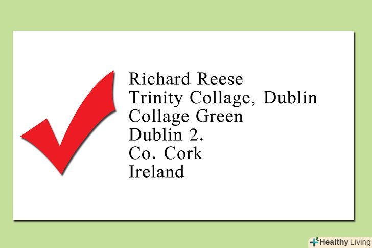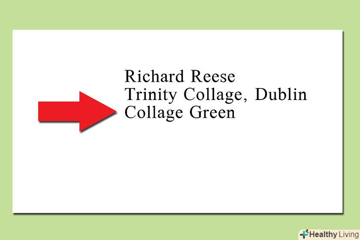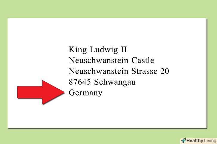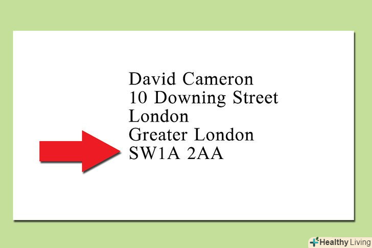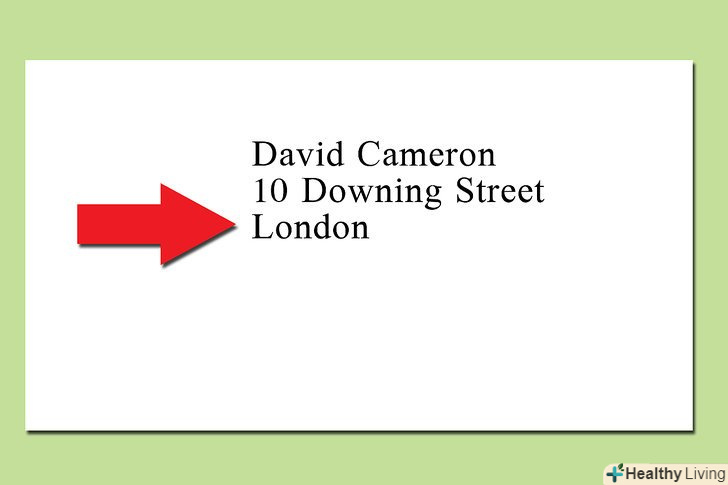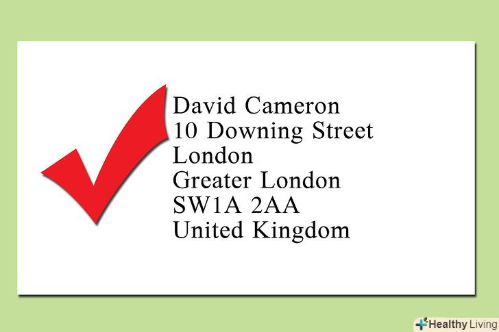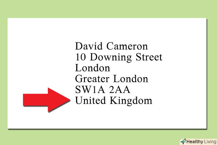- Якщо ви відправляєте лист закордон, вкажіть назву країни великими літерами в самому останньому рядку. Також можна використовувати скорочення, наприклад, "UK" замість " United Kingdom."