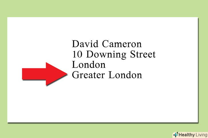 Назву країни напишіть у четвертому рядку.якщо ви відправляєте лист в Лондон, то назву країни можна не вказувати. Але якщо ви відправляєте його в сільську місцевість, то краще вказати її назву. Якщо ви знаєте ще як-небудь уточнення, до примру, назва провінції, графства, то вкажіть і цю інформацію. [3]