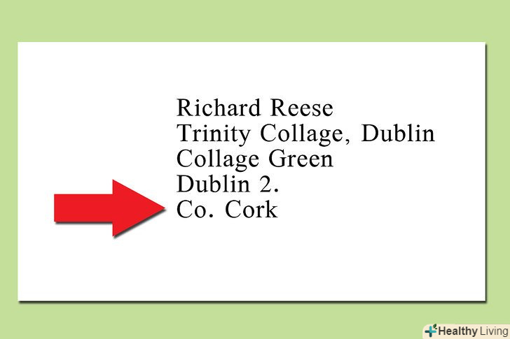 У п'ятому рядку напишіть назву графства (якщо є).якщо ви відправляєте лист у велике місто, як Дублін, графство вказувати не потрібно. Якщо відправляєте лист в сільську місцевість, то назву необхідно вказати.- Запам'ятайте, що в Ірландії слово "графство' "пишеться перед назвою і скорочується як" граф. "Наприклад, якщо ви відправляєте лист в графство Корк, на конверті необхідно вказати" граф. Корк".
