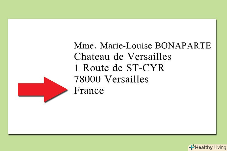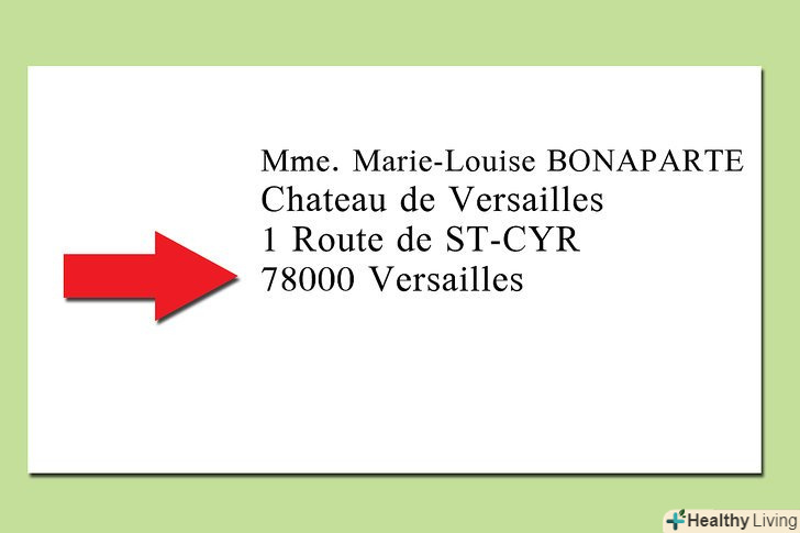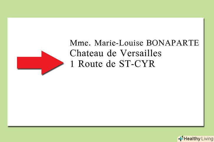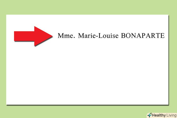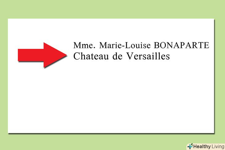 У першому рядку напишіть ім'я одержувача.зверніть увагу, що у Франції прийнято писати прізвище великими літерами, наприклад, "Марія-Луїза БОНАПАРТ". Вкажіть також необхідні звання. Ви можете не писати звання, якщо відправляєте лист друзям або членам сім'ї, але ви повинні вказати, якщо адресат – чиновник, військовий, доктор, професор або літня людина.