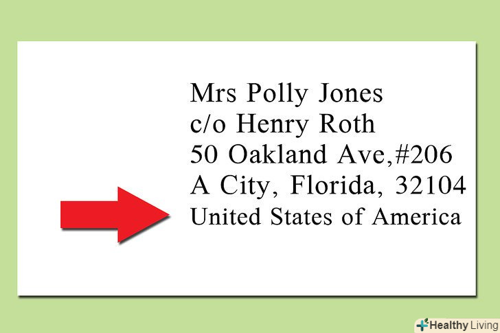 Якщо ви пишете з іншої країни, в адресі необхідно вказати "США".якщо ви відправляєте лист не з США, то формат підпису конверта потрібно змінити. Напишіть місто і штат на одному рядку, "Сполучений Штати Америки" нижче, а на останньому рядку напишіть ZIP-код.