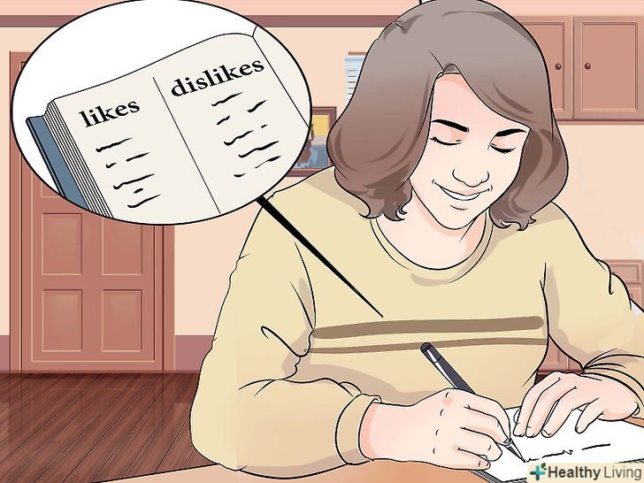 Складайте списки.Списки речей, які важливі для Вас, допоможуть вам краще зрозуміти себе. Ось кілька прикладів таких списків:- " Що мені подобається і не подобається?"Складіть аркуш паперу навпіл, у верхній половині напишіть те, що вам подобається, а в нижній — те, що вам не подобається. Це може зайняти багато часу і місця, тому постарайтеся обмежитися однією категорією На список: Фільми, книги, Їжа, Ігри, люди.