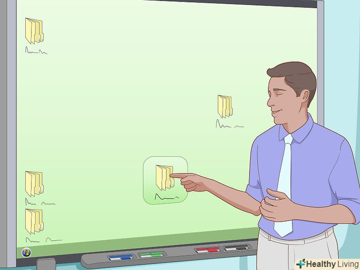 Використовуйте Notebook, щоб запустити на інтерактивній дошці браузер, Powerpoint або відео.перейдіть в Notebook Smartboard на комп'ютері. Доступ до браузерів та інших програм можна отримати через спадний список у верхньому лівому куті екрана. Якщо ви хочете відобразити збережений файл, натисніть "Відкрити" у спадному списку, а потім виберіть потрібний файл.- Такі дошки набирають популярність в школах, оскільки роблять навчання інтерактивним і допомагають вчителям адаптувати навчальний план для учнів з різним стилем навчання. Кінестетики, наприклад, можуть стосуватися і писати на дошці, тоді як візуали можуть спостерігати за проекціями та іншими графічними елементами.[6]