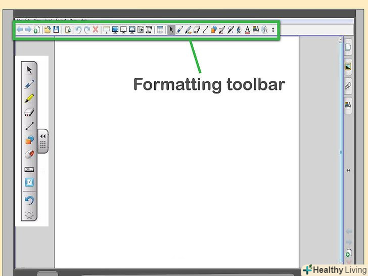 Використовуйте панель форматування для доступу до спеціальних інструментів.панель форматування знаходиться у верхній частині інтерактивної дошки, а також в Smartboard Notebook на комп'ютері. Кожна кнопка відповідає за окрему функцію. Щоб їх активувати, потрібно лише натиснути на одну з кнопок на дошці.[3]- Інтерактивна дошка має десятки можливих кнопок залежно від програмного забезпечення, але деякі зустрічаються частіше, ніж інші. "Зберегти", "Перо», «стерти»і«Скасувати»/ "Повторити" є одними з найпопулярніших функцій. Торкніться кожної іконки, щоб виконати відповідну команду.