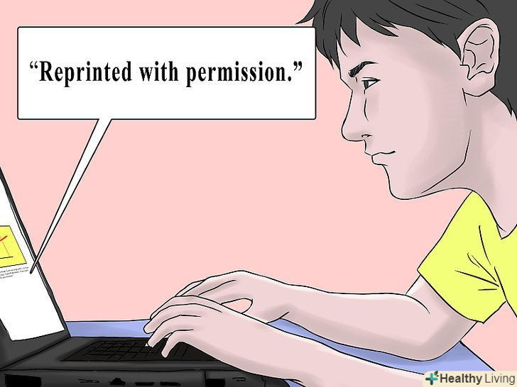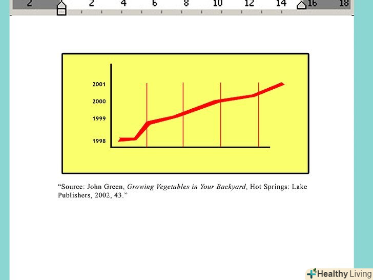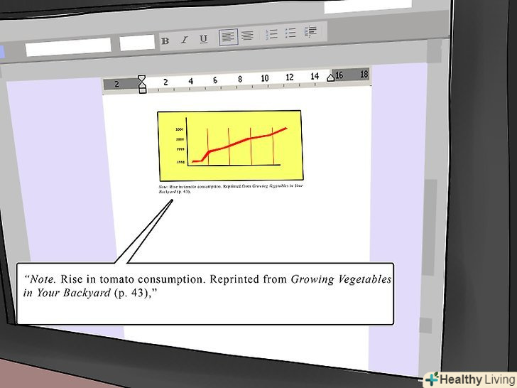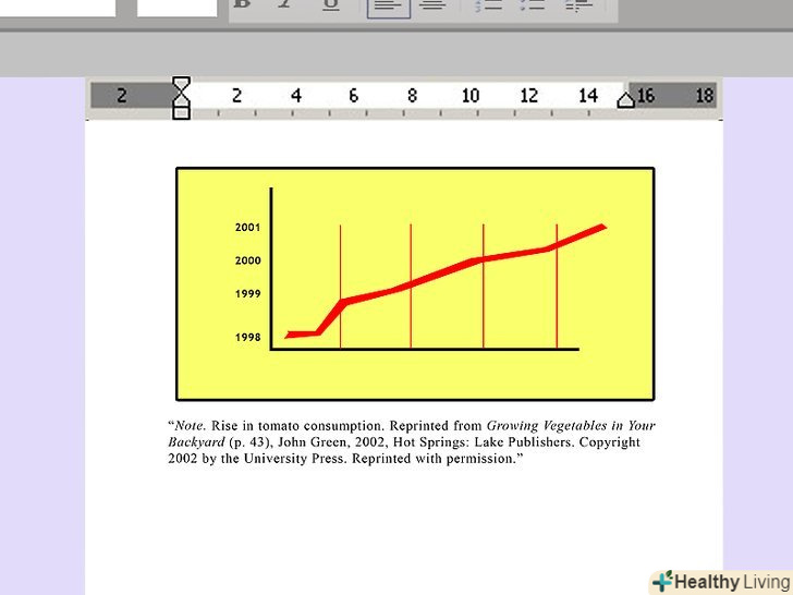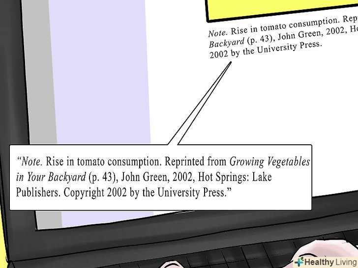 Наберіть в кінці напису"передруковано з дозволу". ви повинні отримати дозвіл, щоб законно написати це. Остаточний вигляд напису повинен бути таким:- ““Примітка. Підвищення споживання помідорів. Передруковано з Вирощування овочів у дворі (С.43), Джон Грін, 2002, Хот-Спрінгс: Лейк Паблішерз. Копірайт 2002, University Press. Передруковано з дозволу.”