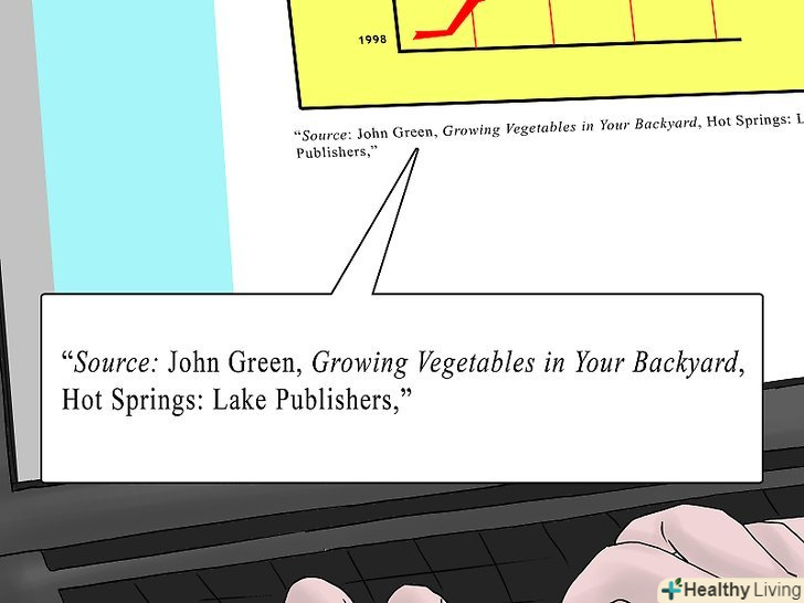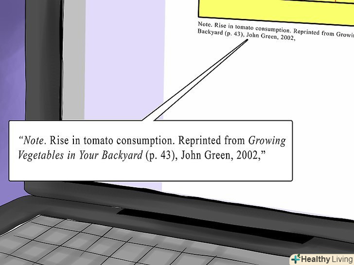 Почніть з написання слова 'Примітки'.щоб почати підпис, наберіть слово" Примітка " курсивом, а потім-опис таблиці. Далі додайте" передруковано з", а потім – назву книги курсивом. За ним помістіть номер сторінки в дужках:- "Примітка. Підвищення споживання помідорів. Передруковано з Вирощування овочів у дворі (С.43)," тут поставте кому.