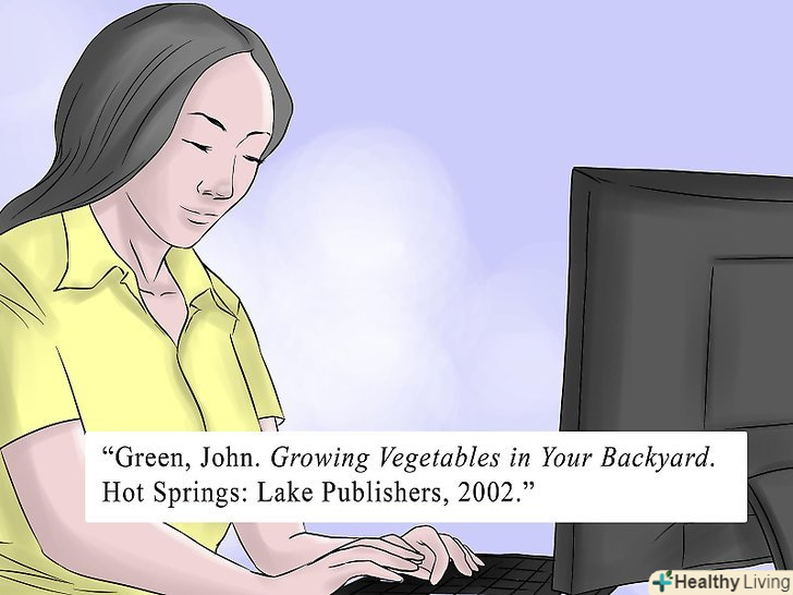 Увімкніть повну назву на сторінці з посиланнями.вкажіть прізвище та ім'я автора, назву курсивом та інформацію про видання. На сторінці з посиланнями номер сторінки не вказується. Посилання повинна буде виглядати наступним чином:- " Грін, Джон.Вирощування овочів у дворі. Хот-Спрінгс: Лейк Паблішерз, 2002.”