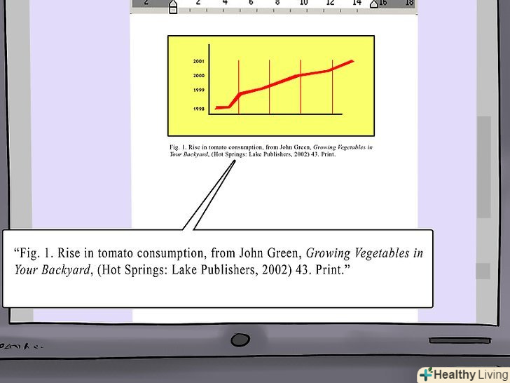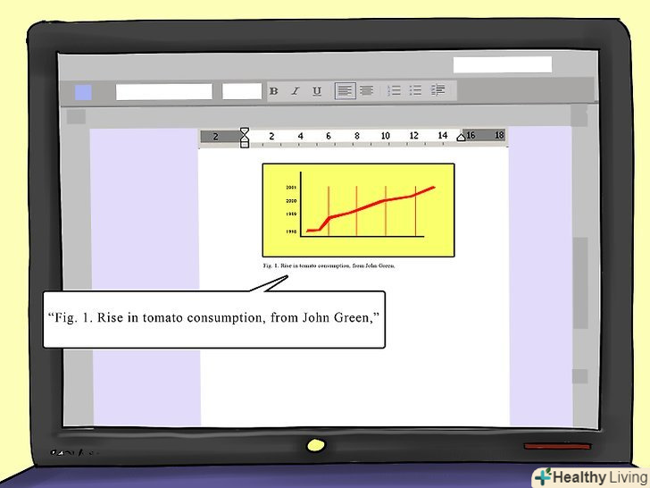 Потім, дайте малюнку назву. Найчастіше назва – це опис. Опис має закінчуватися комою. Додайте після коми "за даними", прізвище та ім'я автора:- " Рис. 1. Підвищення споживання помідорів, за даними Джона Гріна,"