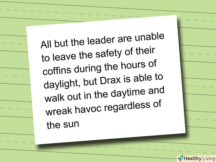- Те, що вам дозволяється скопіювати У інших письменників, це тільки основи. Той факт, що вони п'ють кров, використовується скрізь, але не варто описувати цей процес так само, як і інші автори. Інші безпечні речі, які можна копіювати, це боязнь Сонця, блідість, швидкість і (якщо необхідно) чорне волосся. Але будьте обережні з копіюванням, так як це не зробить вас більш відомим, а за дослівне копіювання вас можуть звинуватити в плагіаті.