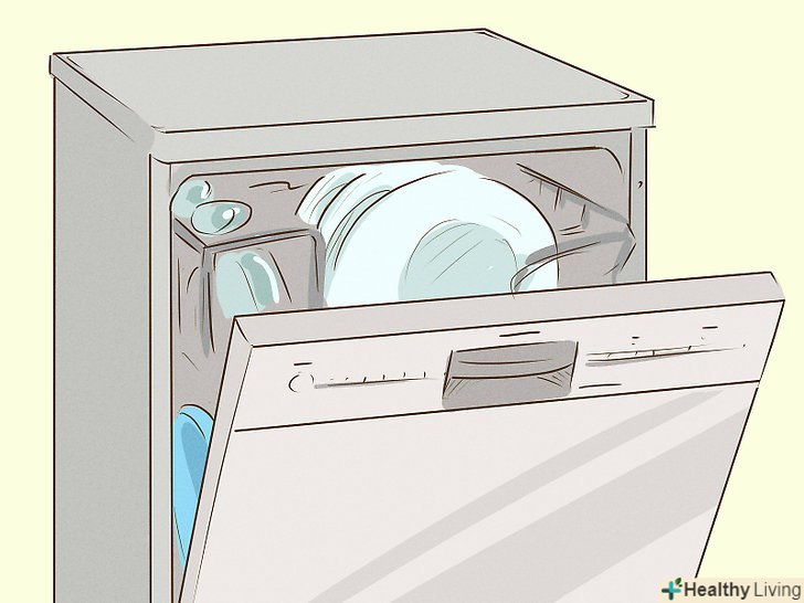 Робіть повне завантаження посудомийної машини.посудомийна машина використовує не тільки багато води, але і електроенергію для нагріву. Якщо включати машину тільки з повним завантаженням, ви почнете не тільки економити на комунальних рахунках, а й скоротите забруднення атмосфери вуглекислим газом на 45 кілограмів на рік.[10]- Якщо вам потрібно вимити кілька тарілок вручну, то використовуйте пробку і наберіть воду в раковину на одну чверть від повного обсягу. Не мийте посуд під проточною водою.