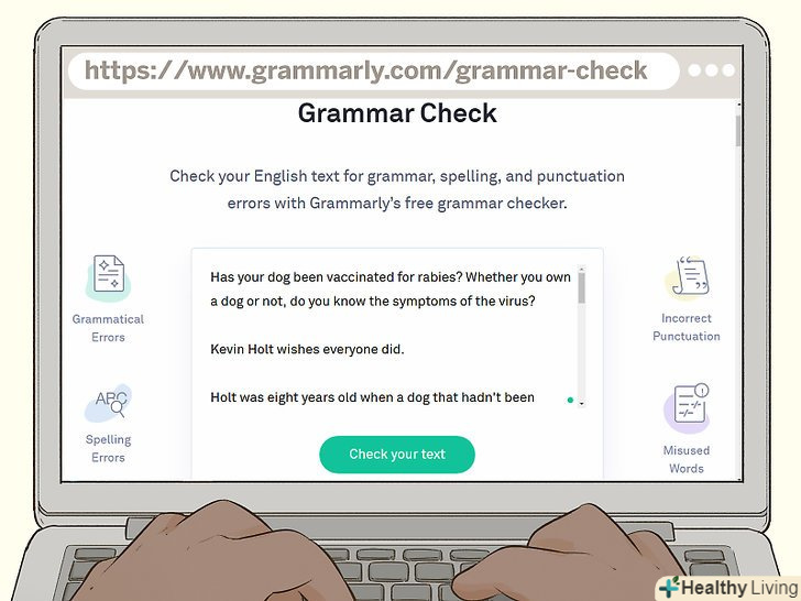 Використовуйте програмне забезпечення для перевірки орфографії, щоб виявити всі помилки.якщо ви пишете в програмі, подібній Microsoft Word, вона буде автоматично перевіряти документ на наявність основних помилок. Є також кілька онлайн-програм, які допомагають редагувати записи. Можна або скопіювати і вставити статтю на один з цих веб-сайтів, або додати перевірку орфографії в якості розширення в браузер. Таким чином, додаток зможе автоматично коригувати все, що ви пишете.[11]- Ось кілька популярних варіантів: Орфограммка, ОРФО online, text.ru і LanguageTool.