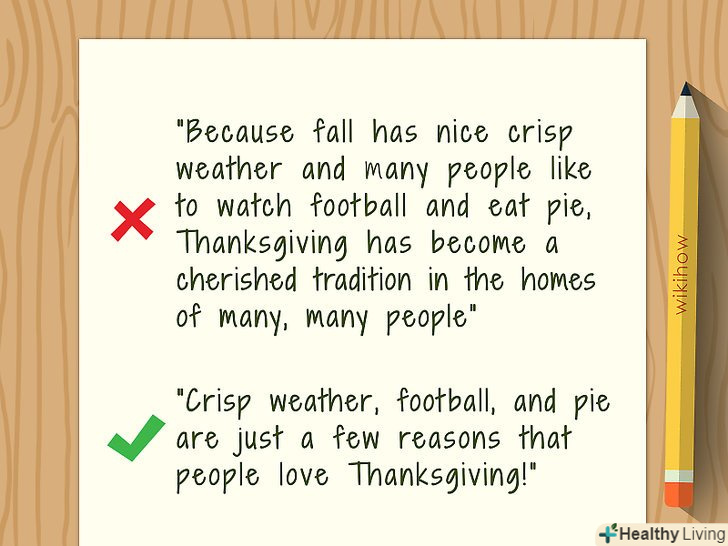 Відредагуйте непотрібну інформацію.може бути дуже важко скорочувати те, над чим ви наполегливо працювали. Однак, як правило, завжди є місця, які можна обрізати. Пошукайте повторення або не дуже корисні приклади. Крім того, зверніть увагу на уривки, які можна скоротити, щоб зробити лист більш лаконічним. Як правило, читачі вище оцінюють систематизовані і спрощені статті.- Замість: "завдяки тому, що багато людей люблять наряджати ялинку блискучим гірляндами, є олів'є і оселедець під шубою, а також збиратися всією сім'єю за одним столом, святкування Нового року стало непорушною традицією в багатьох будинках«, — можна написати так:» ошатна ялинка, олів'є і час з сім'єю — ось всього лише кілька причин, чому люди люблять Новий Рік!»