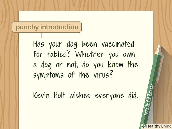 Почніть з одного-двох чіпляючих речень. якщо ваша стаття не буде починатися з цікавого введення, читачі, швидше за все, перегорнуть або прокрутять її. Витратьте час на створення короткого вступу, яке приверне увагу читача. Це може бути питання або цікавий факт — головне, щоб він вводив в тему статті.[5]- Можна написати щось на зразок: "втомилися запікати на Новий Рік прісну курку? Приправте своє святкове меню парою нових і сміливих смаків!»