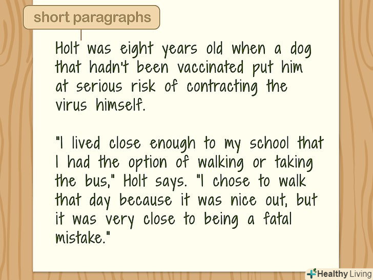 Не пишіть довгі абзаци.ви ж не хочете втратити читача після того, як заволодієте його увагою. Оскільки довгі, важкі для розуміння абзаци можуть втомлювати, краще прагнути до стислості. Абзаци приблизно з трьох-чотирьох речень виглядають візуально привабливо і можуть утримати інтерес читача. [6]- Не висвітлюйте в одному абзаці більше однієї думки, щоб читачеві було простіше засвоювати інформацію. Наприклад, не намагайтеся говорити про гарніри і декорі столу в одному абзаці. Це дві окремі думки.