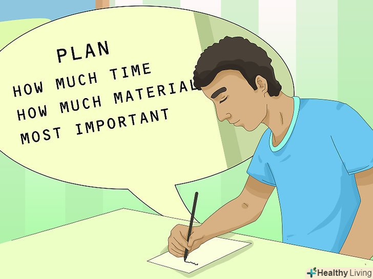 Складіть план занять, щоб структурувати свій час.План повинен бути реалістичним і заснований на іспиті, до якого ви готуєтеся, а також на експертних розрахунках часу, який необхідно вам для підготовки. До деяких іспитів, наприклад, ЄДІ, готуватися потрібно кілька місяців.- Сядьте, Зберіть всі навчальні матеріали і складіть список тем/областей, які вам треба вивчити перед іспитом.[6]