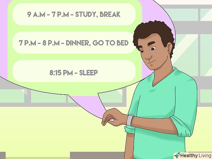 Плануйте заздалегідь, коли Вам потрібно лягти спати і вставати.є особливий спосіб планування, який допоможе вам вчасно лягти спати. Почніть з того часу, коли Вам на наступний день треба бути в екзаменаційній аудиторії або на заняттях. Потім порахуйте все, що ви повинні зробити до цього моменту. Порахуйте весь час, який це у вас займе, додайте до нього сон, і дізнаєтеся, у скільки вам треба лягати, щоб виспатися.- Згадайте, скільки часу у вас зазвичай йде на те, щоб заснути, і врахуйте цей час теж.