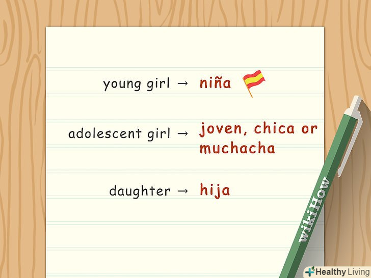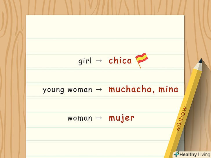 Виберіть слово, що означає "Дівчина / дівчинка".чи хочете ви використовувати слово в значенні "дівчинка" або шукаєте більш доросле звернення? Можна використовувати переклад слова " жінка "або щось більш точно позначає"молода дівчина".- "Chica" позначає дівчинка, але в повсякденності може застосовуватися і до дорослої жінки.