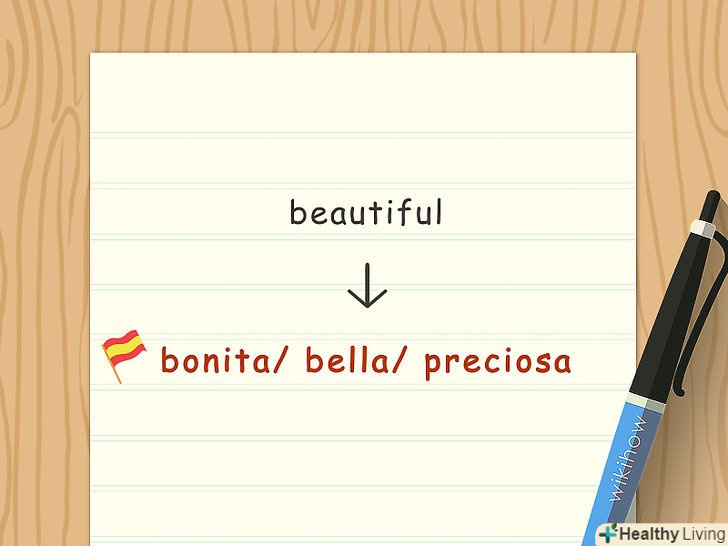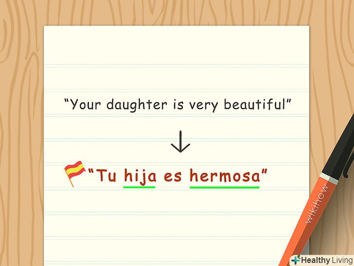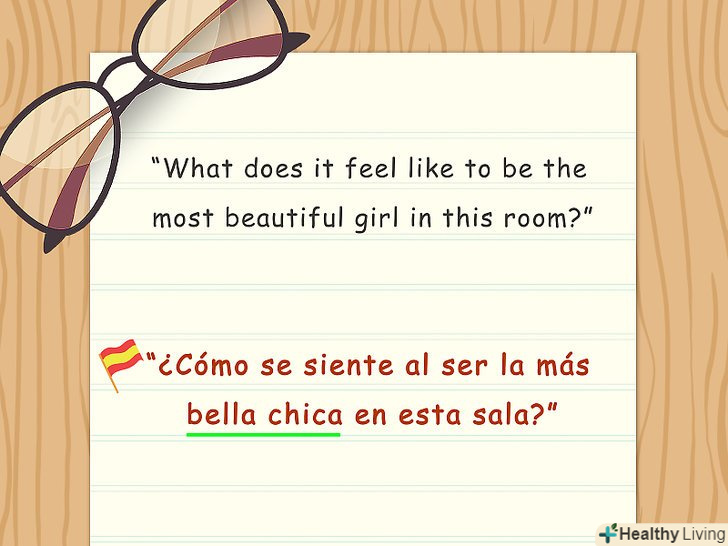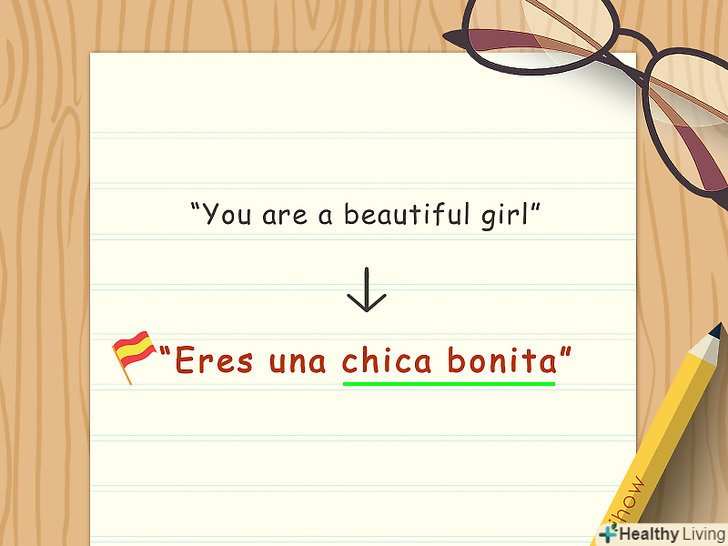 Поєднуйте слова.в іспанській мові прикметники зазвичай ставляться після іменників. У російській мові ми говоримо" красива дівчина", проте в іспанському це буде"la chica bella". У цьому випадку "la chica" – це іменник (дівчина), а" bella " - це прикметник (красива).[8]- Можна поекспериментувати з побудовою пропозицій. Наприклад:" ти – красива дівчинка/дівчина "або"Eres una chica bonita".