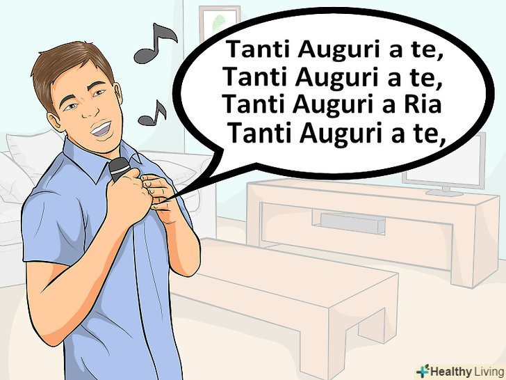 Пропийте" tanti auguri " кілька разів.найпоширеніші слова для пісні" з днем народження " не згадують про день народження зовсім. Замість цього використовується вираз "найкращих побажань" замість слів "happy birthday" в оригінальному звучанні.- Додайте до виразу " a te "(а ти), що означає"Тебе/тобі".