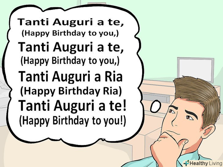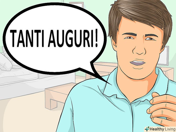 Побажайте " tanti auguri!".[2] цей вислів не перекладається як "щасливого дня народження". Насправді, італійське слово " день народження "(compleanno ) взагалі не з'являється в цій фразі. Проте, даний вислів, що позначає "найкращі побажання", є в Італії популярним способом висловити своє прихильність до людини, у якого день народження.- Tanti означає "Багато", а auguri є множиною від іменника augurio, "побажання". Дослівно фраза перекладається як "багато побажань".