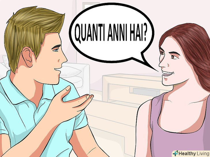 Запитайте людину про його вік: " quanti anni hai?"[5] це ухильний спосіб з'ясувати, скільки йому або їй років. Питання не перекладається конкретно як " наскільки ти старий?”. Швидше це ввічливе цікавість щодо хлопця чи дівчини: "як багато тобі років?”- Quanti означає "Як багато",anni - "років", аhai – це дієслово "мати" у формі другої особи, однини (аналогічно з англійським дієсловом "have").