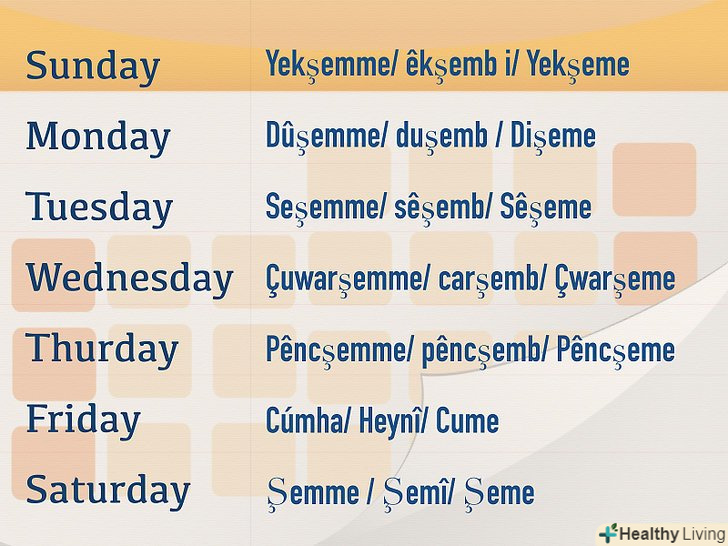 Нижче представлені дні тижня.- Неділя: Yekşemme/ yekşanbi / Yekşeme