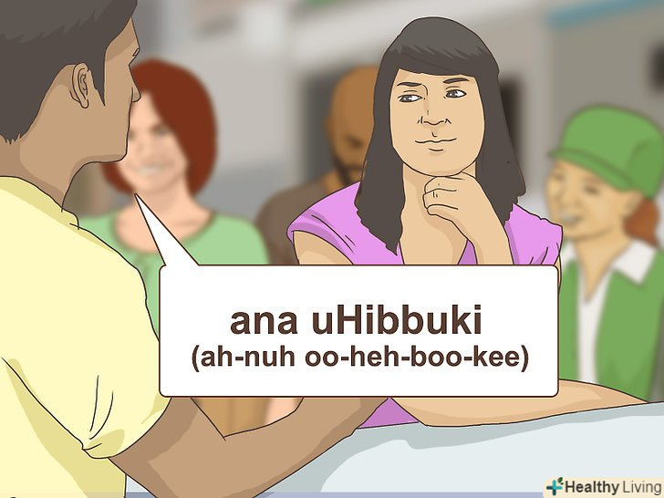 Скажіть "ana uHibbuki", щоб офіційно і публічно оголосити про свою любов до жінки. "Ana" вимовляється як "а-на "і співзвучно з ім'ям"Анна". Використовуйте цей спосіб визнання в любові в ситуаціях, коли хочете, щоб ваша кохана і хтось ще знали про ваші справжні почуття.[1]