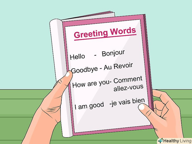 Вивчіть кілька привітань перш, ніж будете вивчати алфавіт.завдяки цьому, коли ви почнете вивчати алфавіт, Ви вже будете знати кілька базових слів. Наприклад,» Здрастуйте«,» до побачення«,» як справи«,» у мене все відмінно«,» як вас звуть«,» мене звуть... " і так далі.