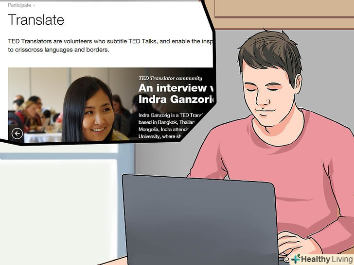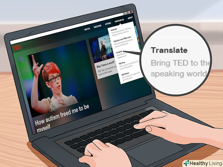 Увійдіть на TED.створивши свій аккаунт, увійдіть на головний сайт TED.- У правому верхньому куті знаходиться спливаюче меню, яке називається " Participate "(брати участь). Наведіть на нього курсор. Одна з опцій - це "Translate" (переклад). Натисніть на неї, щоб перейти на сторінку перекладів TED.