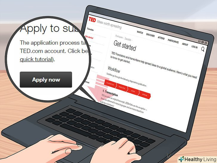 Заповніть заявку. перейшовши на сторінку «Get started» (почати), внизу Ви повинні побачити кнопку "Apply now" (подати заявку). Натисніть на неї. Це перенаправить вас на сторінку amara.org. Amara-це платформа, яку TED використовує для перекладу та створення субтитрів.[3] у додатку вам буде задано чотири питання:- Чому ви хочете займатися створенням субтитрів / перекладів для TED. Цілком згодиться відповідь типу»я хочу перекладати для TED, тому що мрію бути частиною цієї спільноти і відточувати свої лінгвістичні навички".