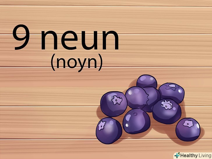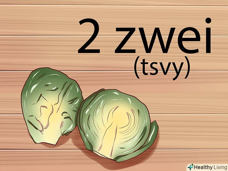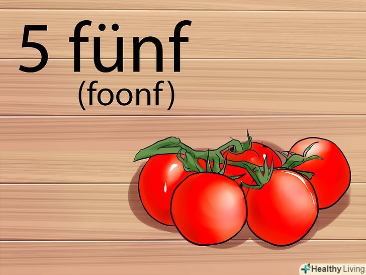 Навчіться вимовляти німецькі голосні. і хоча в німецькій мові є деякі схожості з англійською, деякі голосні вимовляються інакше. Це дуже важливо враховувати, коли ви намагаєтеся рахувати по-німецьки.[2]- У німецькій мові комбінації голосних " ei "вимовляються як" i "(ай) в англійському слові" lie "(лай) або" dry " (драй). Наприклад, слово" drei " по-німецьки означає три. Але вимовляється воно як" dry " (драй). Також, німецьке слово " frei "(свобода) вимовляється як" fry " (фрай).