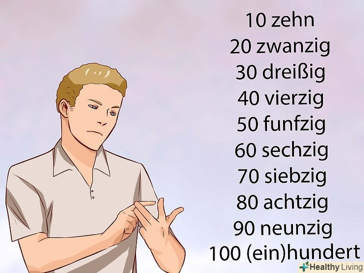 - Дотримуйтесь того ж алгоритму на всьому шляху до 100. Тільки замість zwanzig, замініть слова на 30 ("dreißig", де ß — це "ss" (сс) по-німецьки вимовляється так само, як і англійська "s" (ес)), 40 ("vierzig" – вимовляється як "feahtsig' (фийэциг)), 50 ("funfzig" (фюнфциг)), 60 ("sechzig" (зэхциг)), 70 ("siebzig" (зибциг)), 80 ("achtzig" (ахтциг)) і 90 ("neunzig" (нойнциг)). 100 по — німецьки-це "(ein)hundert" (при вимові буква "d" звучить як "t", а "u" як "oo" (у)).