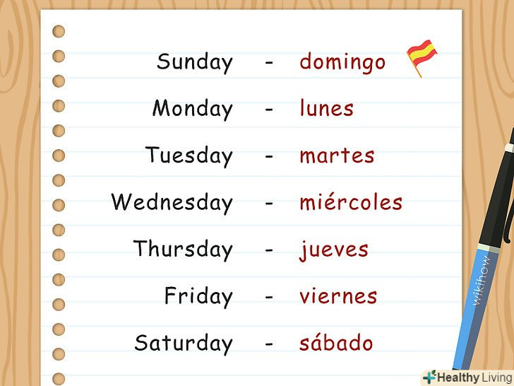 Напишіть день тижня.іноді при написанні дати необхідно вказувати і день тижня, на який ця дата припадає. Так само, як і місяці, дні тижня в іспанській мові не пишуться з великої літери.[12]- Неділя -domingo.