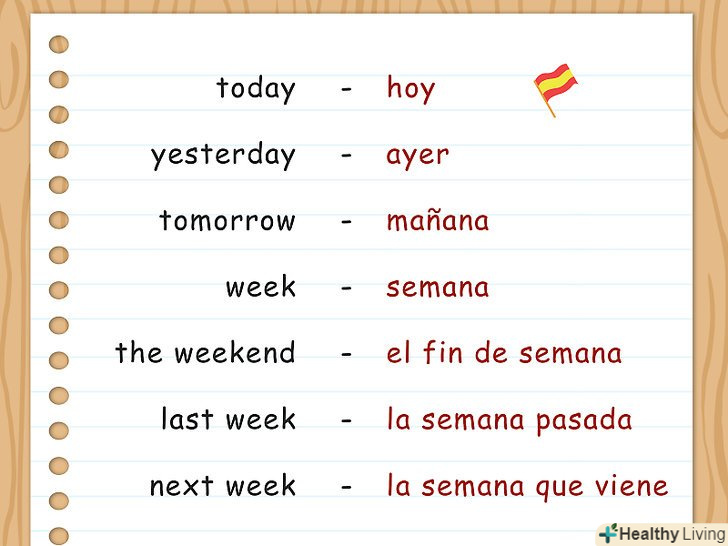 - Слово тижденьіспанською мовою — semana. Якщо ви хочете написати вихідні, використовуйте el fin de semana. Говоріть про цей тиждень як esta semanaі про минулий тижденьяк la semana pasada. Якщо ви хочете написати про наступного тижня, використовуйте фразу la semana que viene, яка буквально перекладається як: тиждень, який прийде.