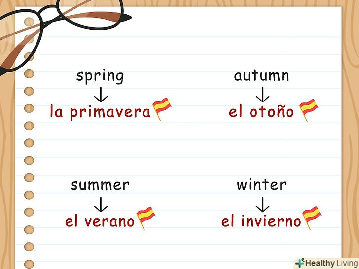 Згадайте пору року. коли ви пишете дату, ви також можете порахувати потрібним сказати про пору року, який відповідає цій даті. Майте на увазі, що на південь від екватора пори року протилежні тим, що на північ від екватора.[14]- Напишітьla primavera, щоб позначити весну.
