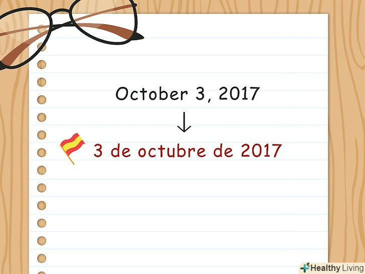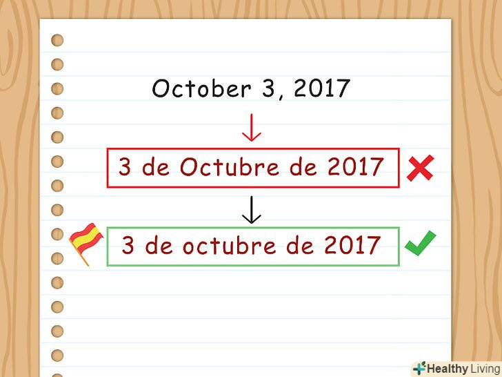Не пишіть назву місяця з великої літери. в іспанській мові, так само, як і російській і деяких інших мовах, не треба писати назву місяця з великої літери. Коли пишете дату, переконайтеся, що назва місяця написано з маленької літери.[5]- Наприклад,3 de octubre de 2017, а не 3 de Octubre de 2017.