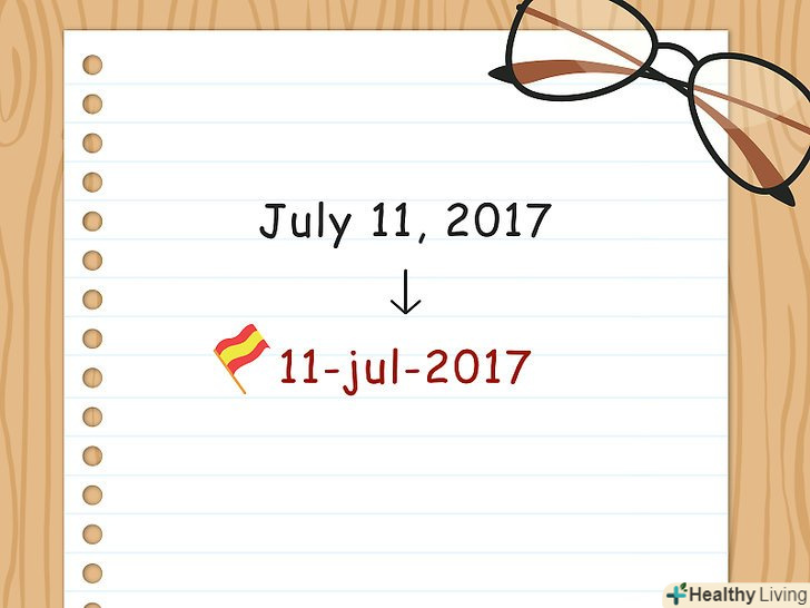 Розпишіть дату в повній формі.використовуйте той же формат "день, місяць, рік", коли пишете дату повністю. День і рік позначаються цифрами, а місяць словом. Частини дати поділяються словом de, яке вказує на родовий відмінок.[3]- Наприклад, якщо ви хочете позначити дату3 жовтня 2017 року іспанською мовою, напишіть 3 de octubre de 2017 (буквальний переклад: третє Жовтня 2017). Так само, як і в російській мові, кому ставити не потрібно.[4]