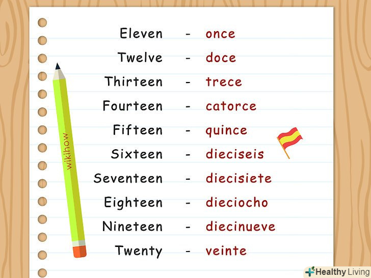 Навчіться писати цифри після 10.Так як в місяці може бути аж до 31 дня, не можна зупинитися на перших 10 цифрах. В іспанській мові числа від 11 до 15 мають власні назви, в той час як назви інших чисел слідують за шаблоном.[10]- Якщо ви ще не знаєте слова, якими позначаються цифри іспанською мовою, Читання і написання дат-відмінний спосіб потренуватися.