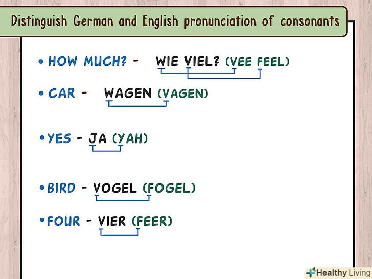 Вимова деяких приголосних в російській і німецькій мові різниться.хоча більшість німецьких букв виглядають, як напевно знайомі вам англійські, їх вимова трохи інше. Якщо ви вже вчили англійську мову, доведеться трохи потренуватися у вимові, щоб правильно вимовляти німецькі слова.[21][22]- Звук "w" вимовляється, як"в".