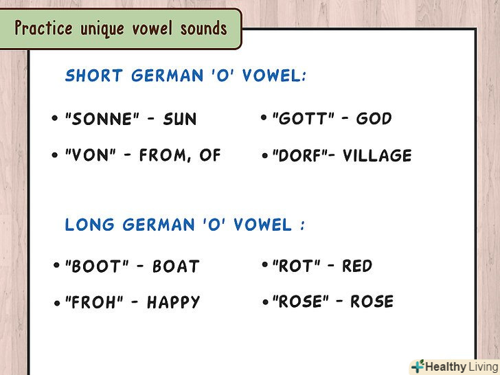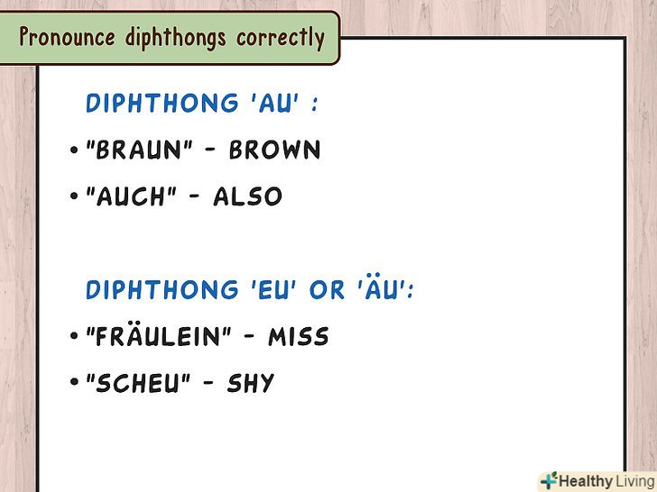 Навчіться правильно вимовляти дифтонги.Дифтонг-це комбінація двох голосних, які об'єднані в один звук. Однак, якщо ви почнете "витягати" слово, можна почути обидва ці звуку.[25][26]- Наприклад, німецькі дифтонги "eu" і "äu" вимовляються так само, як звук "о" в таких словах, як "довго"або " голосно".