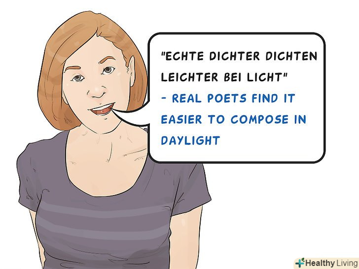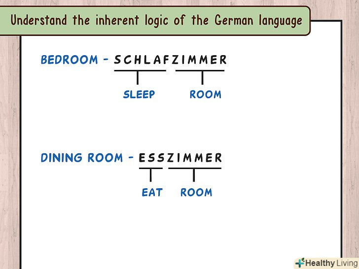 Зрозумійте логіку німецької мови. На відміну від англійської або французької, в німецькому є логічний зв'язок між об'єднанням слів. Ця логіка допоможе зрозуміти, як утворюються німецькі слова, а також їх сенс.[19][20]- Ви легко побачите цю ж логіку, якщо спробуєте назвати кімнати в будинку по-німецьки. Слово " кімната "в німецькій мові – це" zimmer " (циммер). І багато німецьких слів, що позначають якусь кімнату, закінчуються словом "zimmer", а починаються дієсловом, який описує, що відбувається в цій кімнаті.