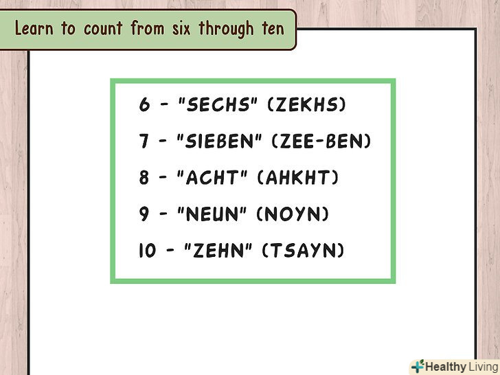 Тепер навчитеся рахувати від шести до десяти.як тільки ви запам'ятаєте цифри від одного до п'яти, можна перейти до вивчення наступної п'ятірки. Нижче перераховані цифри від шести до десяти німецькою мовою з вимовою в дужках після слова:[7][8]- Шість - "sechs" (зекс). Поєднання " ch "вимовляється, як звук" к " (у вимові бере участь тильна сторона горла). Подумайте про те, що ви робите, коли намагаєтеся трохи відкашлятися (схожий звук видає кішка, коли шипить);